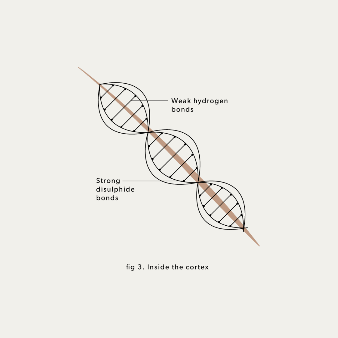 Beneath the cuticle is the cortex, this is where the color of your hair comes from. The cortex is held together by hydrogen and disulphide bonds. (Fig 3) Disulphide bonds are one of the strongest naturally occurring bonds in nature. While it is the shape of your follicle that determines whether your hair is straight or curly, it is your disulphide bonds that keep your hair in this shape. When you have a perm it is the disulphide bonds that are broken then reformed once your hair is in your new chosen shape.