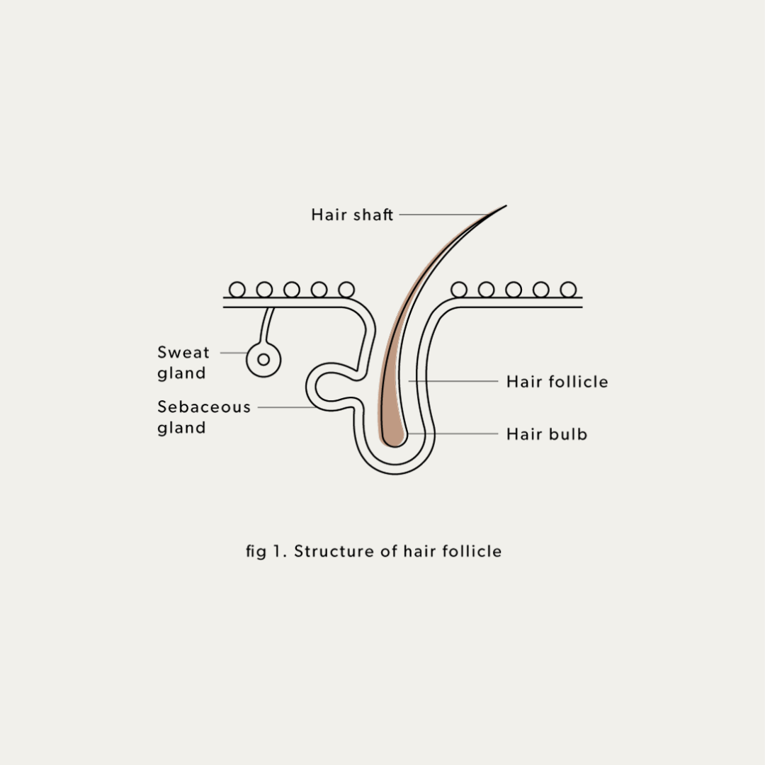 The scalp is made up of thousands of hair follicles. Each hair shaft grows out of its own follicle starting at the hair bulb, every follicle containing its personalised protective oil (sebum) gland (Fig 1).