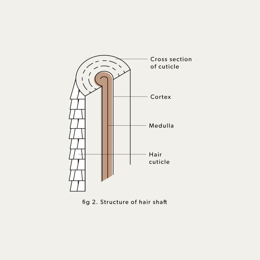 The hair shaft itself is made-up of 3 layers, the outer cuticle, middle cortex and central medulla. Some very thin hairs do not have a medulla. (Fig 2). Hair is made of keratin, a naturally strong structure;, healthy hair can hold up to 30% its own weight.